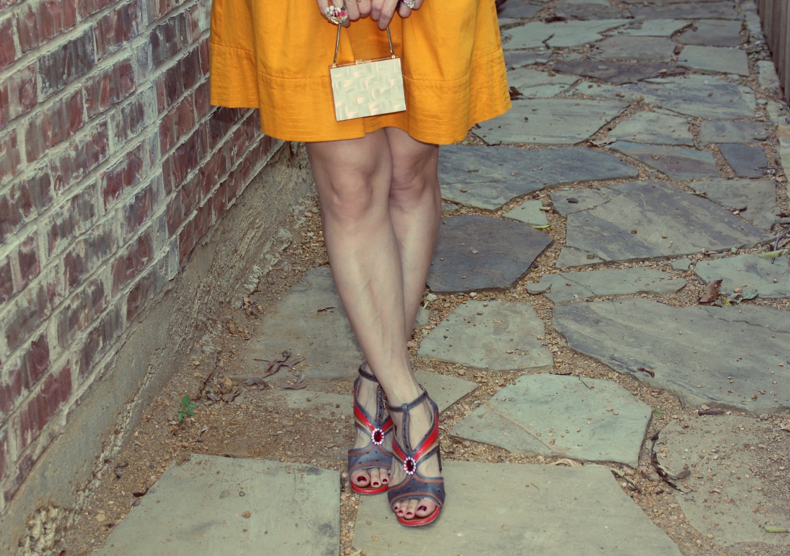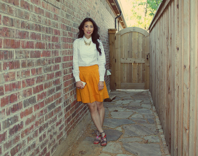 Love the mustard, white and red combo. You look beautiful.