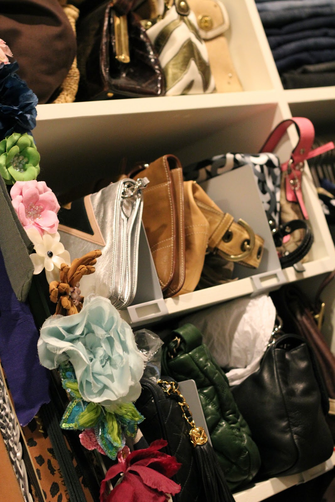 Handbags: I borrowed this idea from Kelly of The Glamourai. These IKEA shelves are perfect to separate spaces for handbags. {There is a taller set also.}