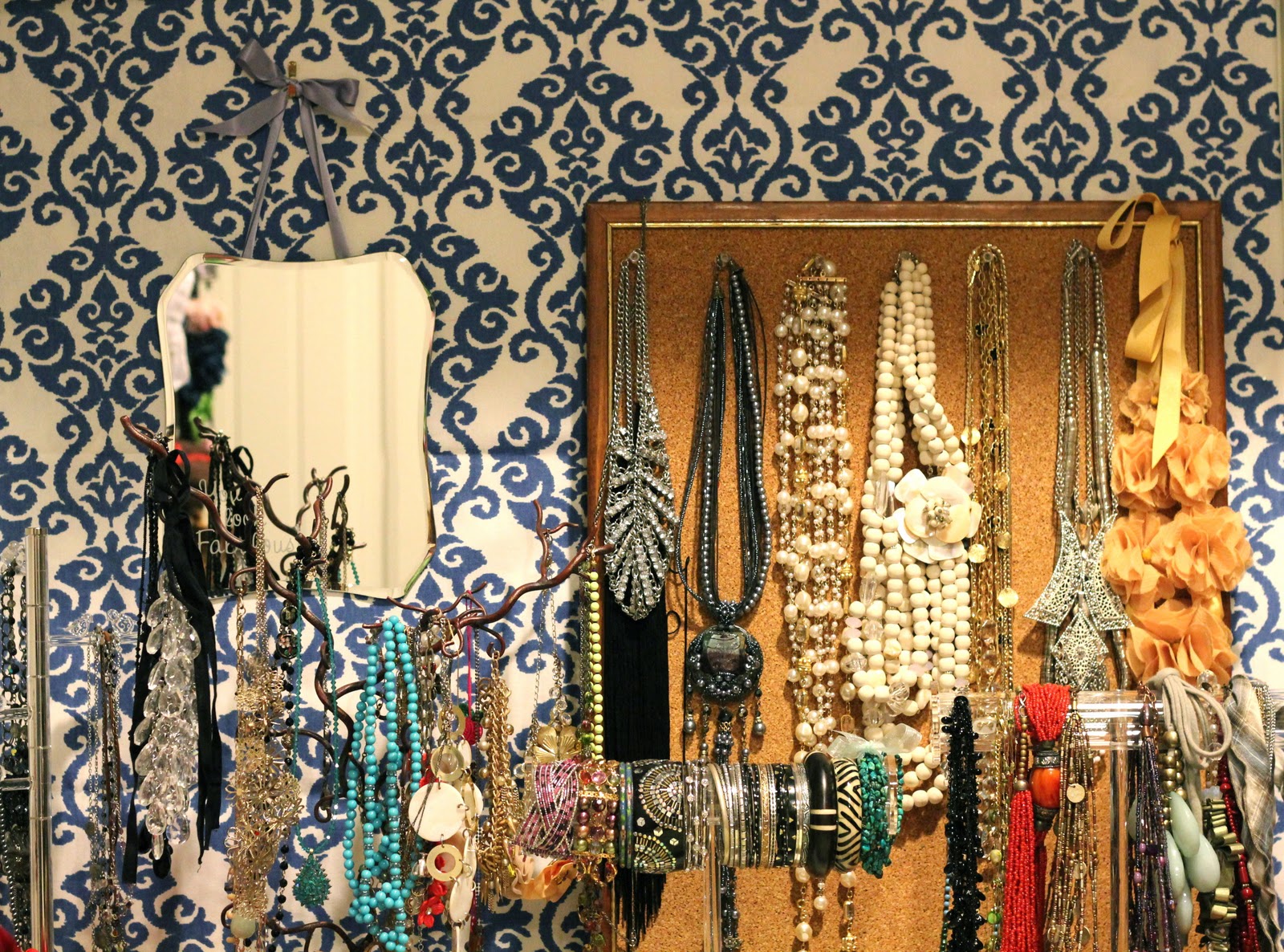 Necklaces: Mine are displayed on a jewelry tree {as seen above}. You can find similar things at Marshalls {or I like this one}! To display my longer necklaces, I used an old cork-board and pins. {To get really fancy, I could have spray painted the corkboard!}