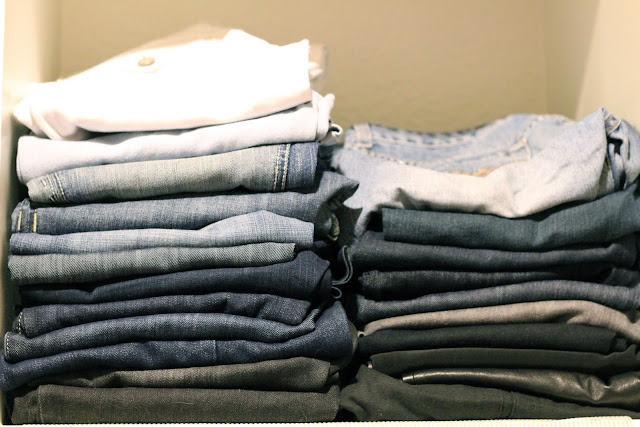 Jeans: Instead of taking up precious hanging space, I fold my jeans into thirds and have two piles. One pile is for boot cut/flare jeans, and the other pile is for skinny jeans.