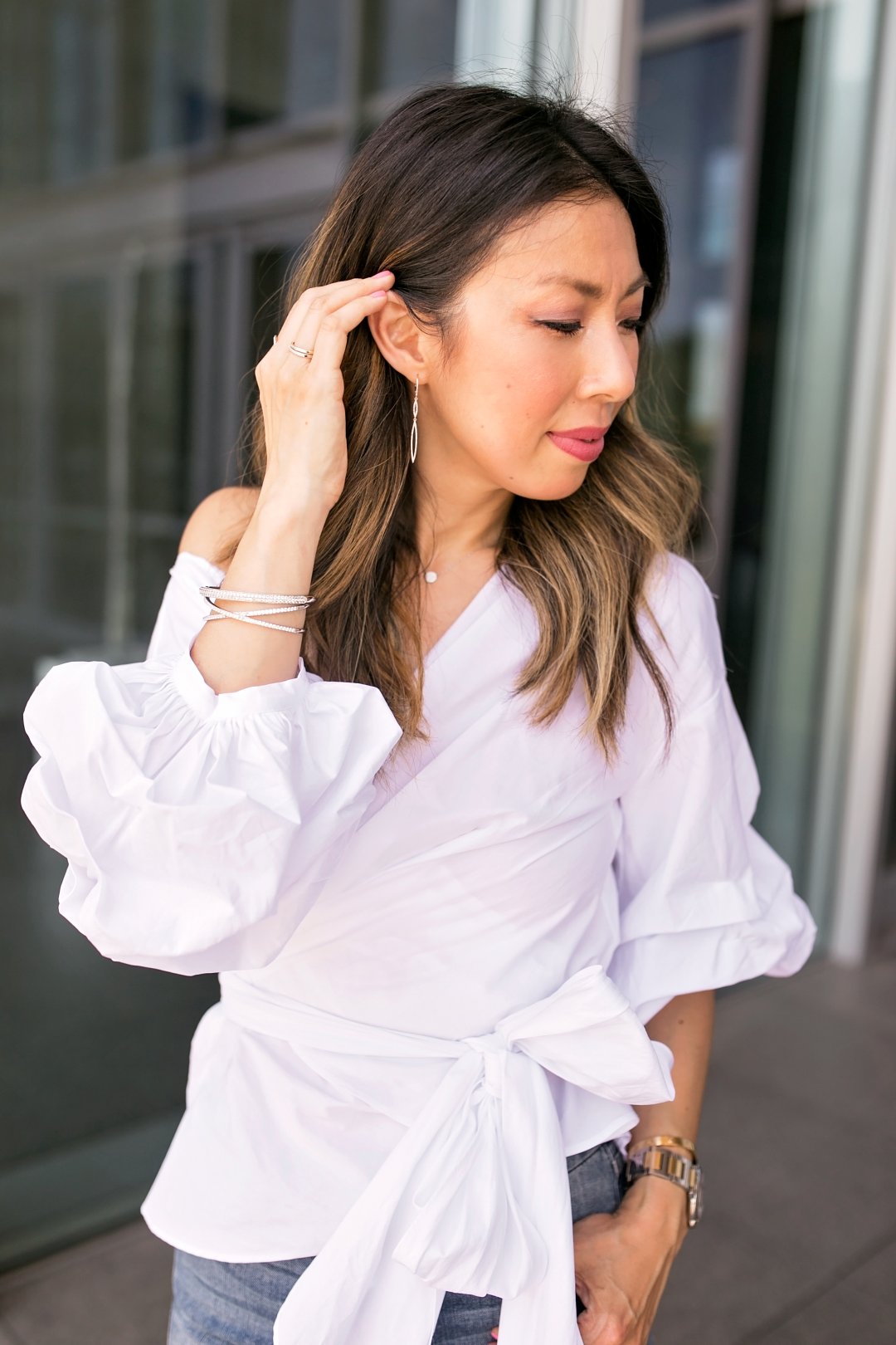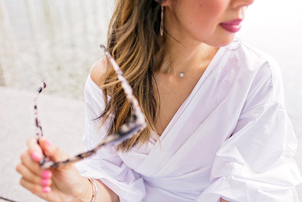 Even If I’m dressing casual, I still want to stand out. Diamond jewelry pieces help me do exactly that! I am wearing a dressed up variation of my uniform (usually a white tee and jeans). The diamond pieces are simple and elegant but elevate my look, and who doesn’t want a daily dose of sparkle?