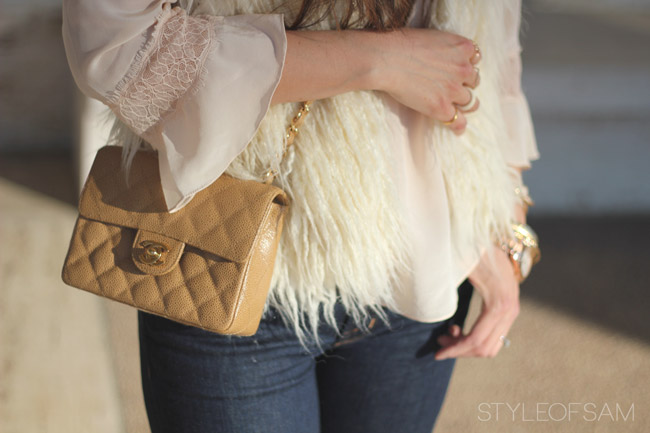 Sam….the fur is beautiful. I’m liking fur this year more than ever. I also love the flare jeans, the cream top and faux vest. Love the 70’s vibe of it.