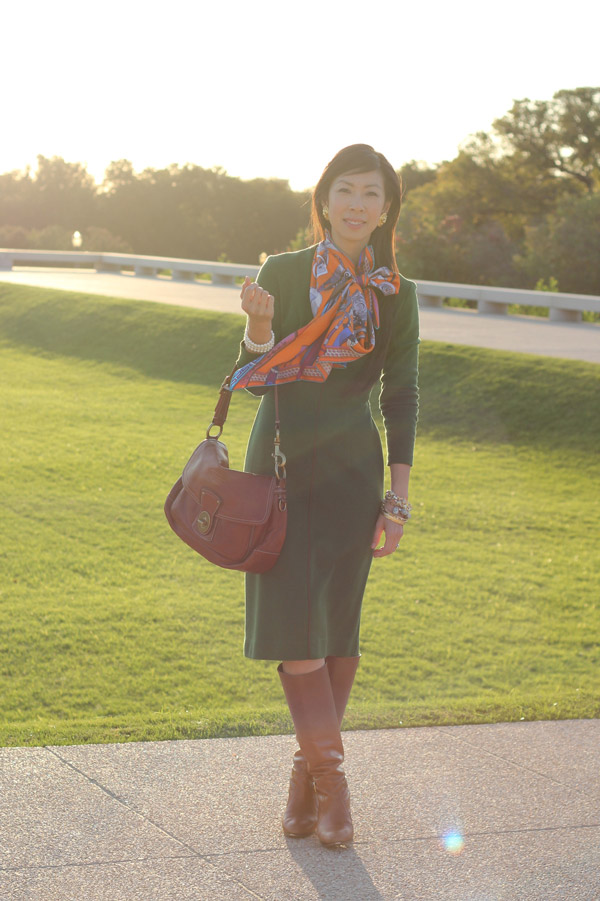 Green is definitely one of the “IT” color this season and your scarf and boots compliment it quite nicely. Love the entire look!