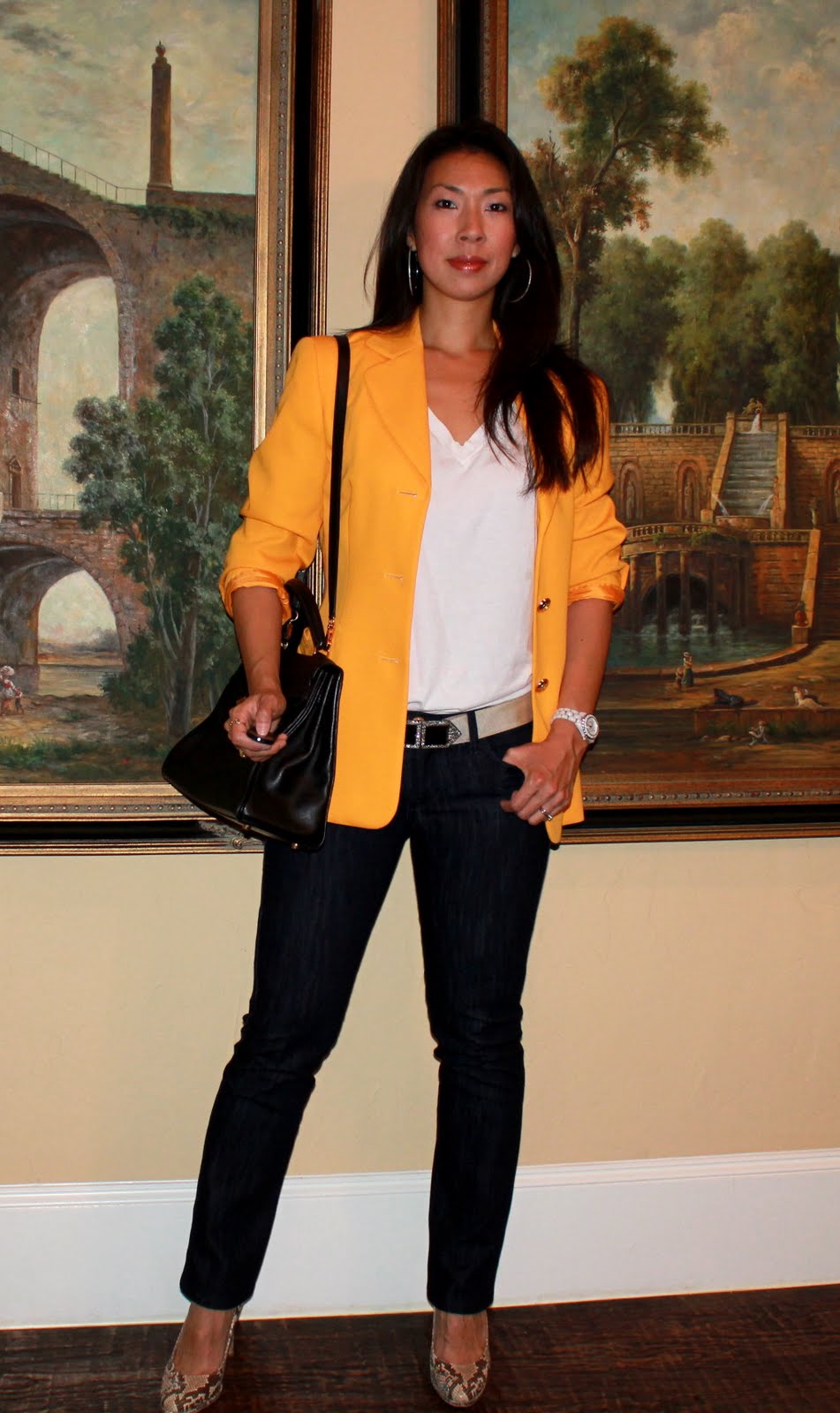 (jacket – Escada, tee – Costco, jeans- Rock and Republic Recession, belt- JCrew, shoe – Coach from Marshalls)