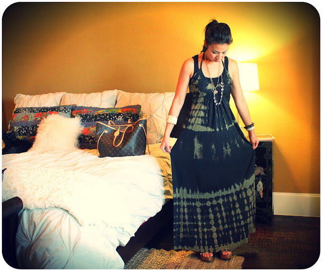 I really LOVE this dress!  It’s super soft and the combination of black and green is interesting, especially this army green.  The tie dye pattern is funky but I like it!  This dress is really strappy, but I didn’t feel like worrying about a special bra so I threw on a tank under it.