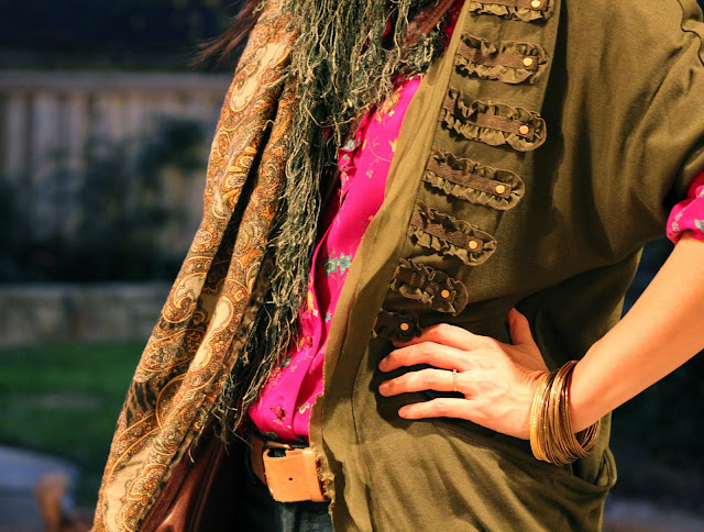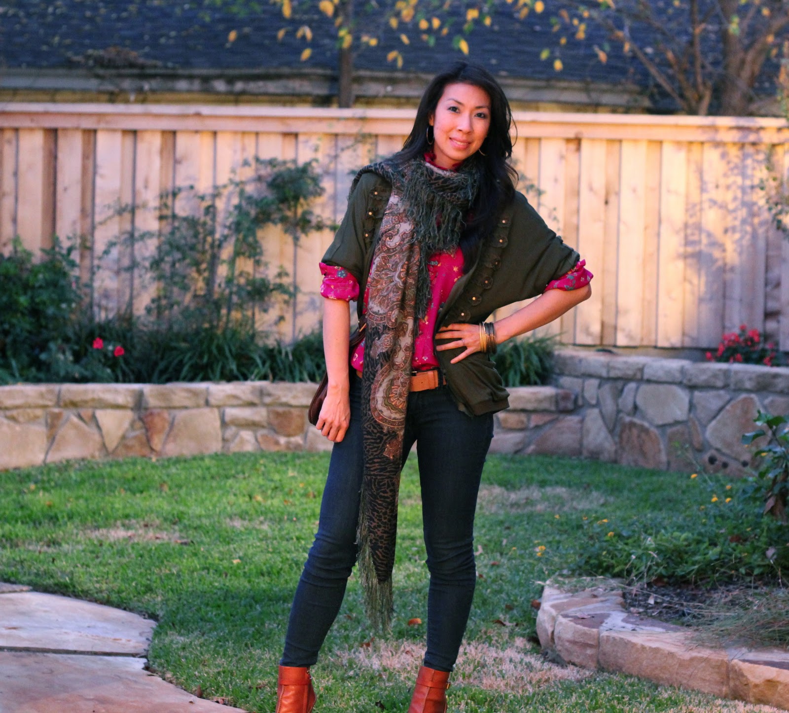 I love the paring of the military jacket with the fuchsia- it looks great! I love the print on the fuchsia blouse too, and those amazing booties!