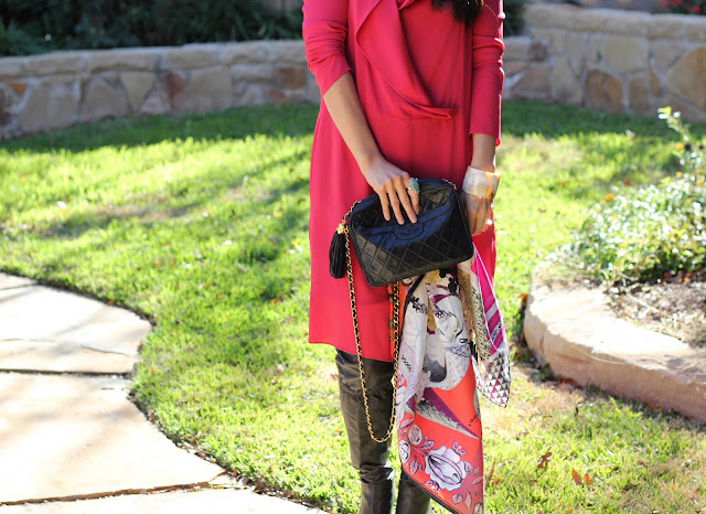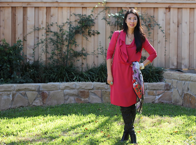 Neiman Marcus Last Call had a huge sale before Thanksgiving, and I had a gift card that was burning a hole in my pocket to use. I went in to browse and found some amazing items like this dress {and this Celine sweater at 90% off retail}! The dress is a stretchy silk, was less than $100, and has pockets! I was drawn to it because of the simple shape and beautiful color. The top is supposed to be buttoned but I left it open to fall and create a nice waterfall effect. Next time, I’ll belt it and wear it buttoned. My OTK Coach boots were a Marshalls find for $39.99! {I think I’ve mentioned them before.}