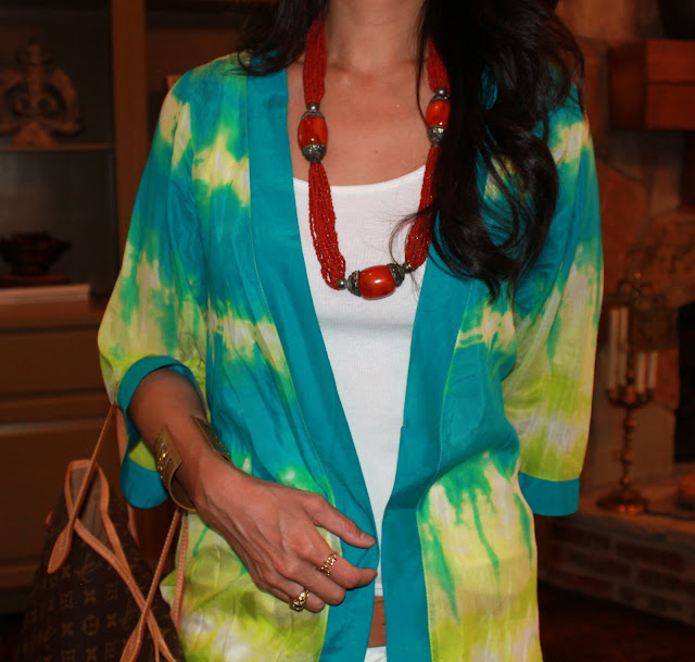 This summer, I’ve really been wearing a lot of white! White makes me think I feel cooler because I’m sure the heat reflects off me (versus black absorbing all the heat… just a little science lesson for you)! When I was at Target running errands and looking at things I don’t need, this bright robe called out of the clearance rack to me! (Let’s ignore the ban thing okay?) It’s perfect to spruce up my whites! Even though it’s “technically” lounge wear for the house, I channeled my inner Nicole Richie and decided to wear it over a white ensemble for a friend’s housewarming party.