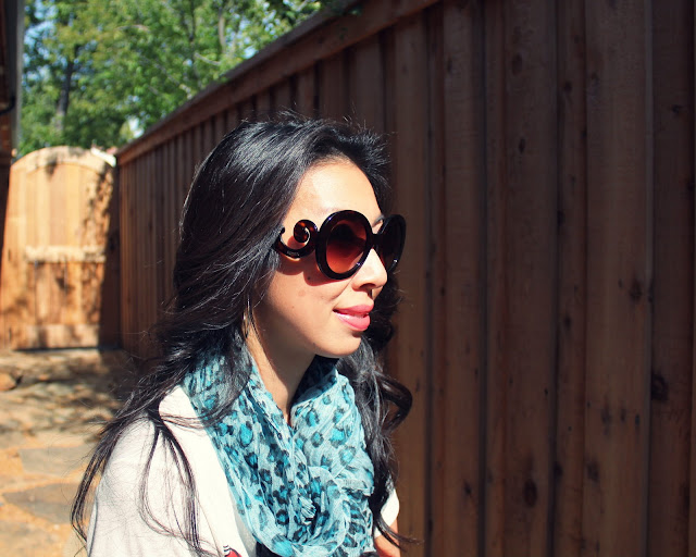 What fantastic sunnies! I have to agree with some of my fellow commenters, you really make a tshirt and jeans look cool, chic and all your own. I love that both your shirt and scarf are patterned, but the look isn’t the least bit busy!