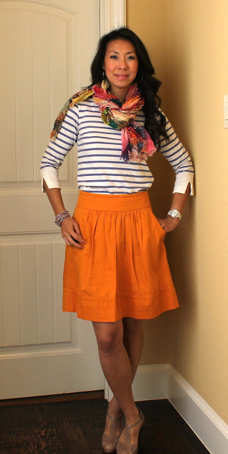 One trend that has always intimidated me is mixing prints. I DON’T know how to approach it OR get away with it! Timidly, I tried pairing this floral scarf and striped shirt (and I even left the house)! Baby steps, baby steps!