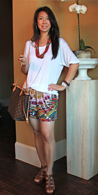 I’m still on a quest for the perfect pair of shorts. Recently, I purchased a pair of shorts from Forever 21. They’re not too short, made of rayon, and were $20. Not too bad of a price to get me through the summer. The only thing is… they are VERY colorful! I like colorful, but it also made me a little nervous. So, I decided to try some different outfits to make sure they were “keepers”.