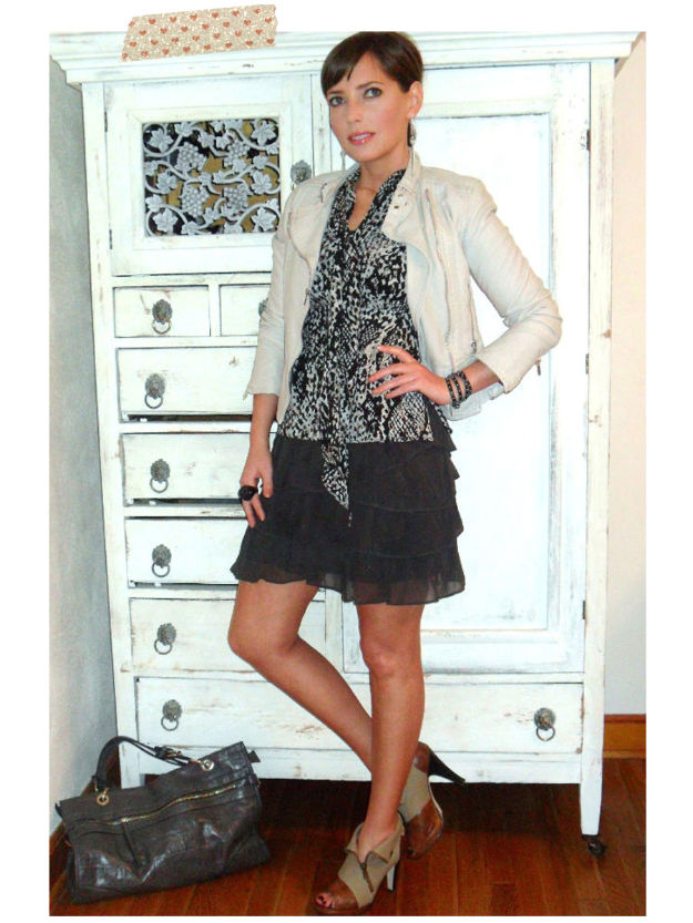 All the way from Australia is Mica of Away from the Blue! She figured a fashion week party would be similar to any other party – so killer heels (wedges), fun printed dress and a pop of colour with the bag with some blingy jewlery. I totally agree! Perfect for this FW party! She shares her love of killer bags and accessories at her blog!