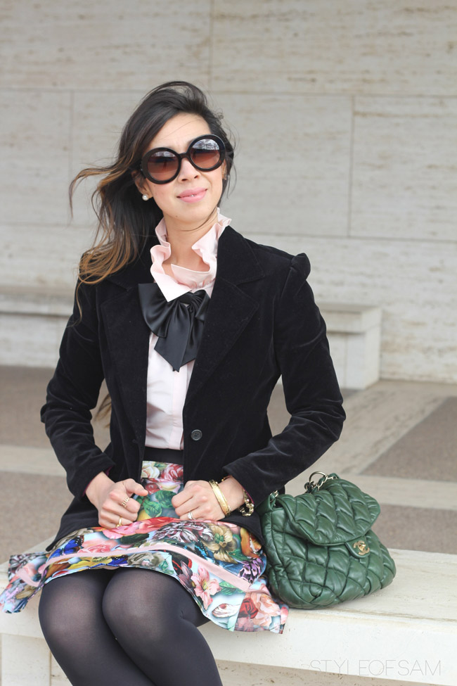 This is the feminine way to wear winter florals. You’ll notice ruffles, bows, pearls, and pink! You may recognize the top from this post and the skirt from this post! If you missed Part I, check out my sassy styling of winter florals here.
