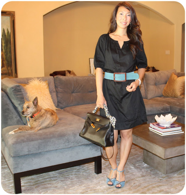 One of my favorite color combinations is black and blue.  It’s a bit unexpected (probably because the first thing that comes to mind is a bruise) but is quite lovely!!  The black dress was a great find at Target for $5 on the sale rack – it has a great classic shape.  And I found the blue belt and shoes at Anthopologie on sale.  The shoes are by Leifsdotter, which surprised me because I thought that they only made clothing!  Here’s my take on black and blue for work!  {Part of my Workin Gal series}