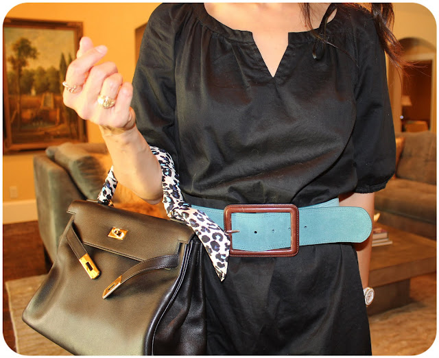Don’t look too closely because the blues don’t actually match.  But from far away, it’s looks similar!  To spruce up my black bag, I added the animal print scarf!  I did it with a different scarf here!