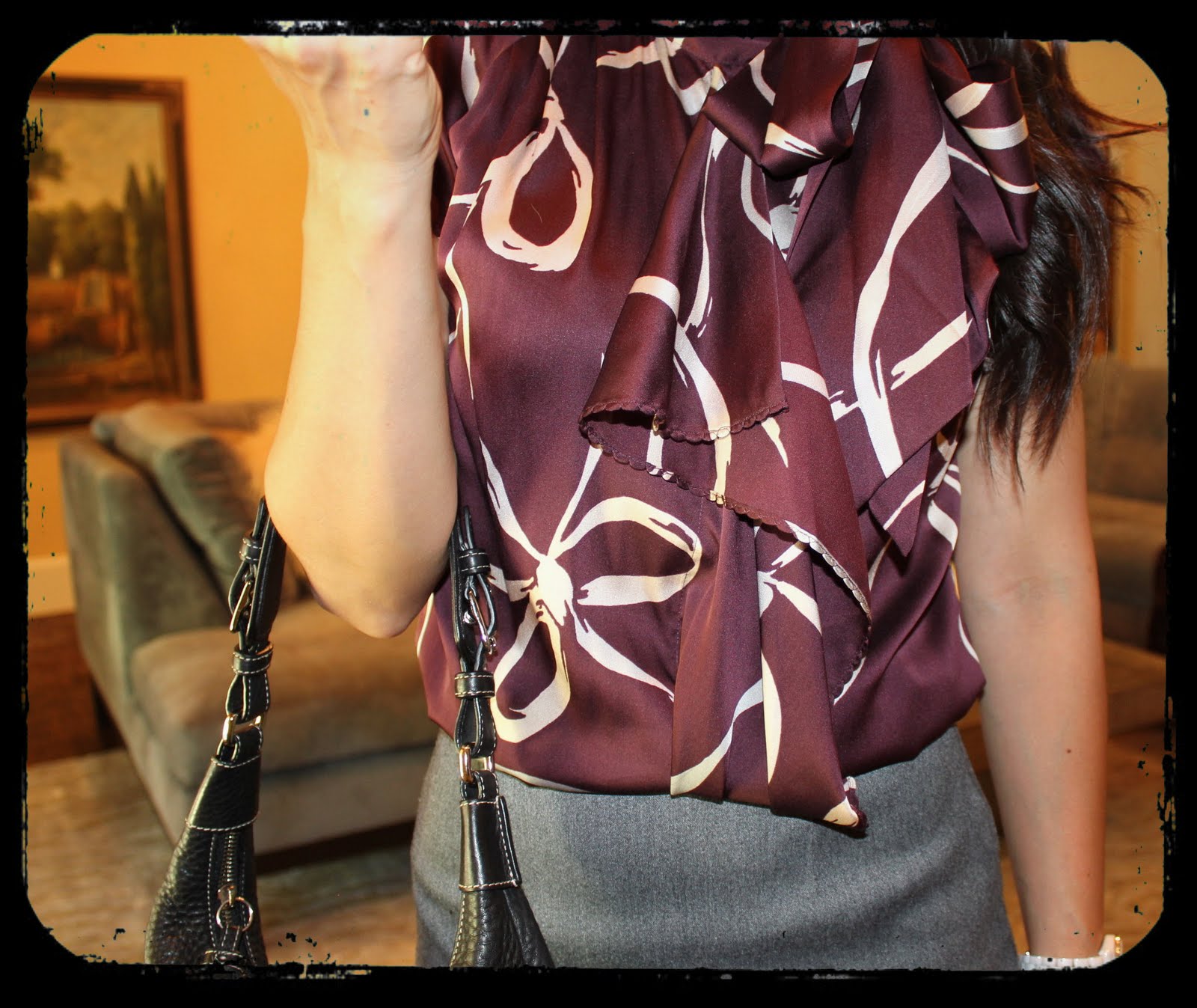 A Fall trend that I’m really looking forward to trying is the feminine silhouette.  I’ve always loved the “Mad Men” look (even before the show) and I have a lot of pieces that work for that style.  Take this Ann Taylor top that I got on sale last winter. I love that it has a neck tie and ruffles down the front.  It’s silky and flowy – two characteristics that I am drawn to in clothes.  And it’s office appropriate (even better)!