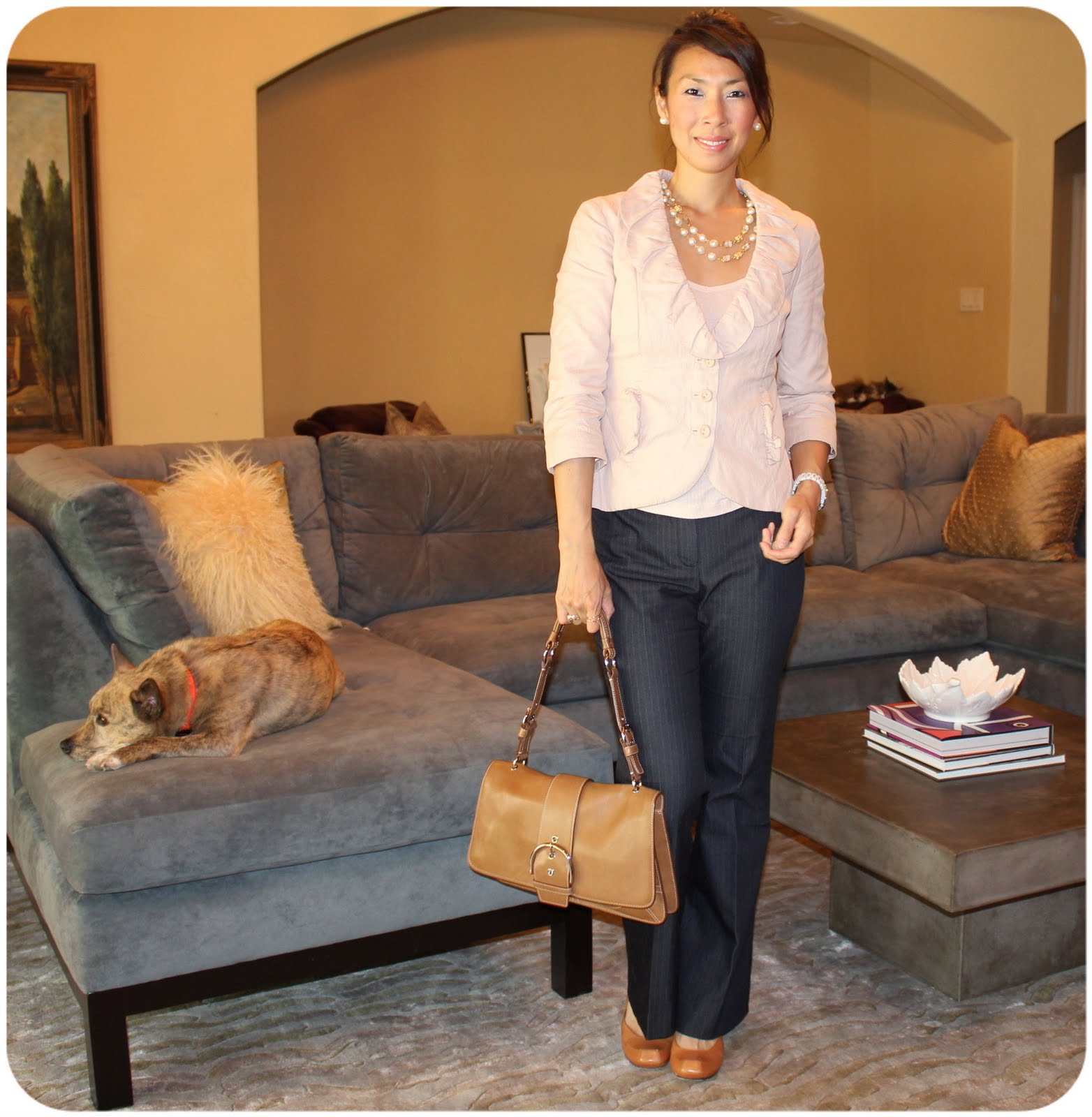 I LOVE girly things, and this jacket is one of my girly faves. It’s a light pink, and has wire threads woven in to give it texture. And the detail on the lapel is fabulous because they look like flower petals! Of course, pearls were the finishing touch to this outfit because… What would a ladylike outfit be without pearls? (And I LOVE pearls in all shapes, sizes, and colors so that’s an easy add on.) {Part of my Workin Gal series}